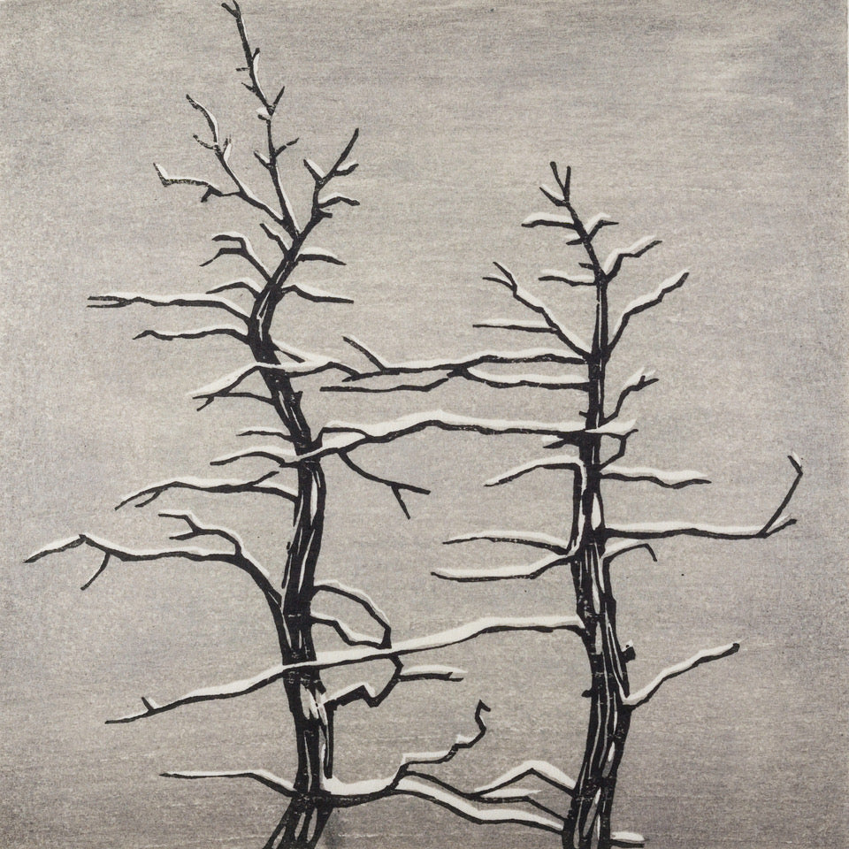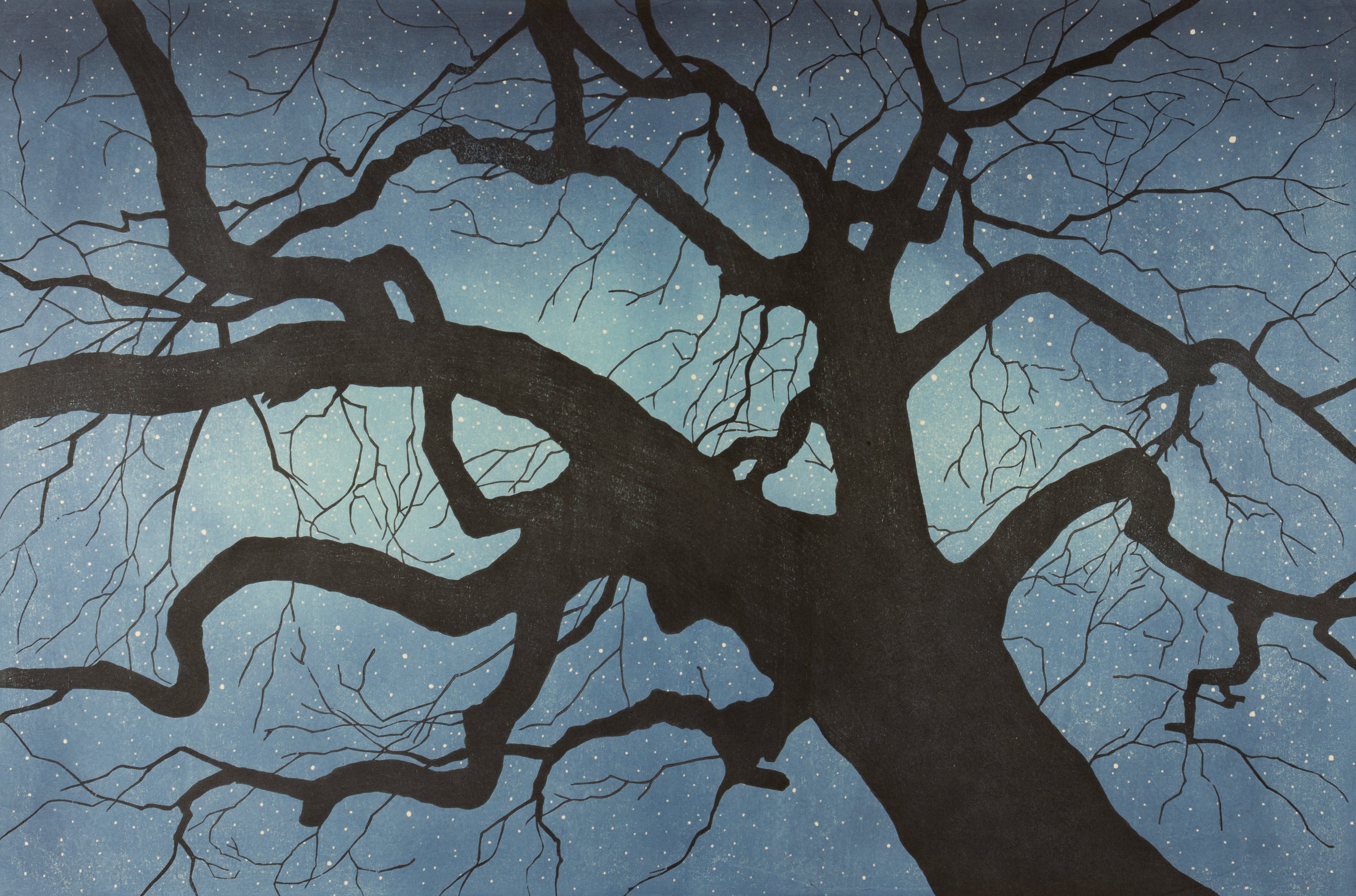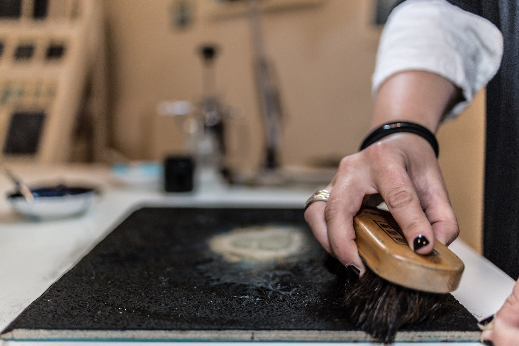 Her newest series of prints, Memento, is focused on the devastation left by several huge wildfires in the valley near her home. She began by sketching the burned trees, then made ink from the soot of the charred bark of these same trees. The prints are made on the Ogawa washi seen here. Scroll down to watch a video about the process.