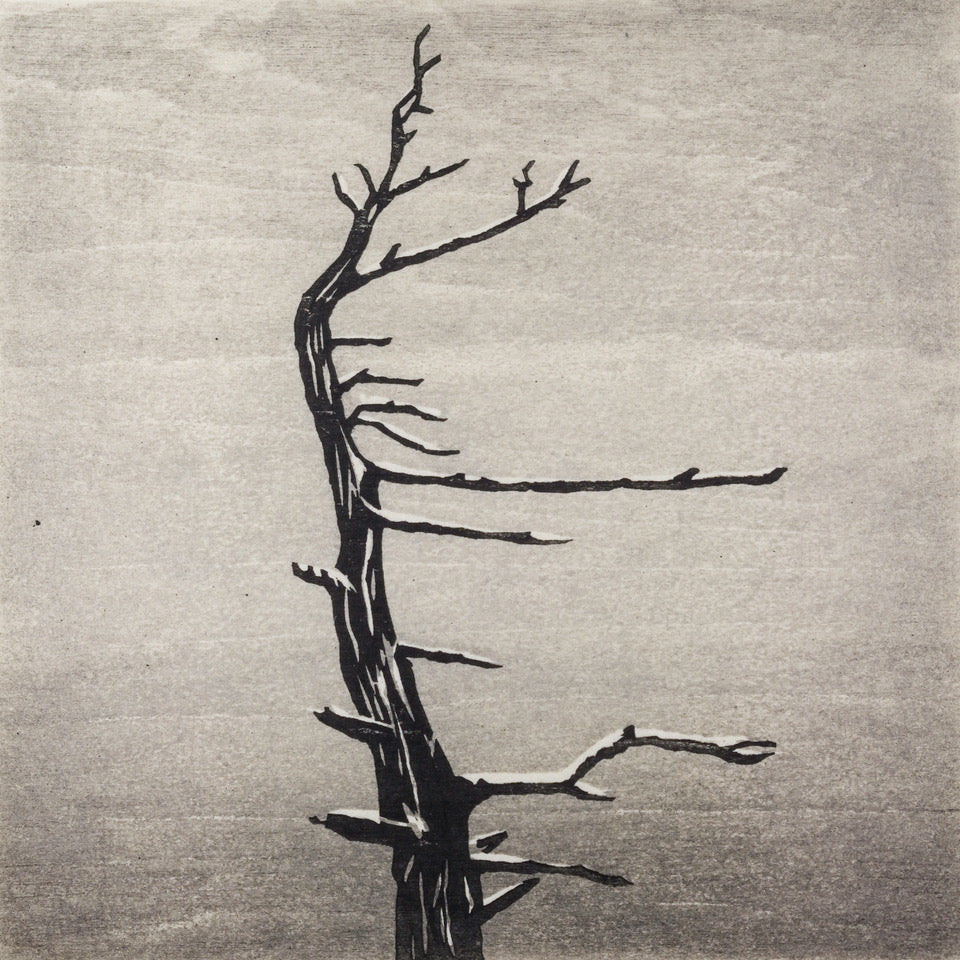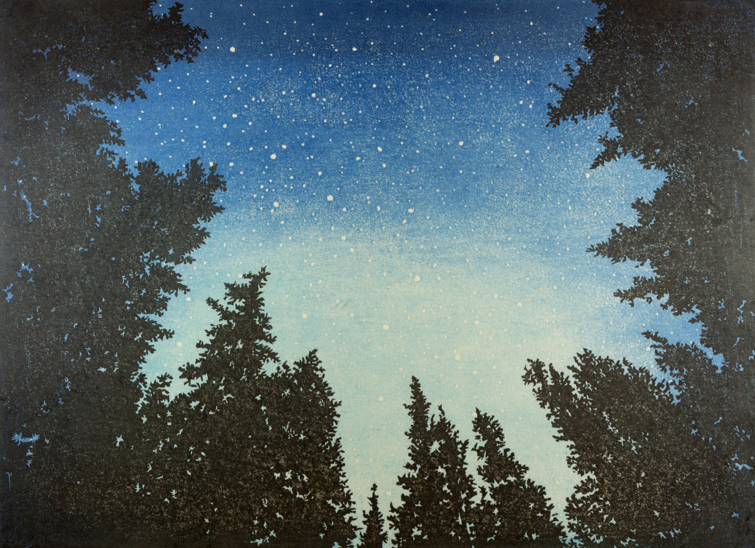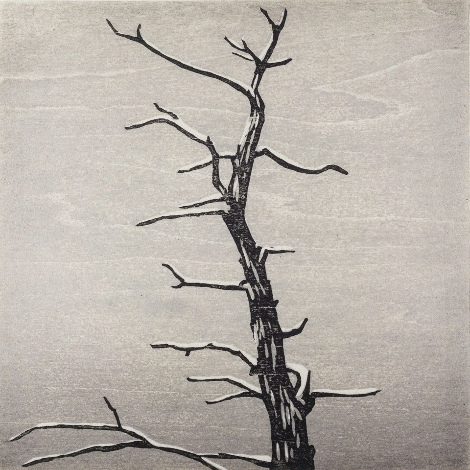 Her newest series of prints, Memento, is focused on the devastation left by several huge wildfires in the valley near her home. She began by sketching the burned trees, then made ink from the soot of the charred bark of these same trees. The prints are made on the Ogawa washi seen here. Scroll down to watch a video about the process.