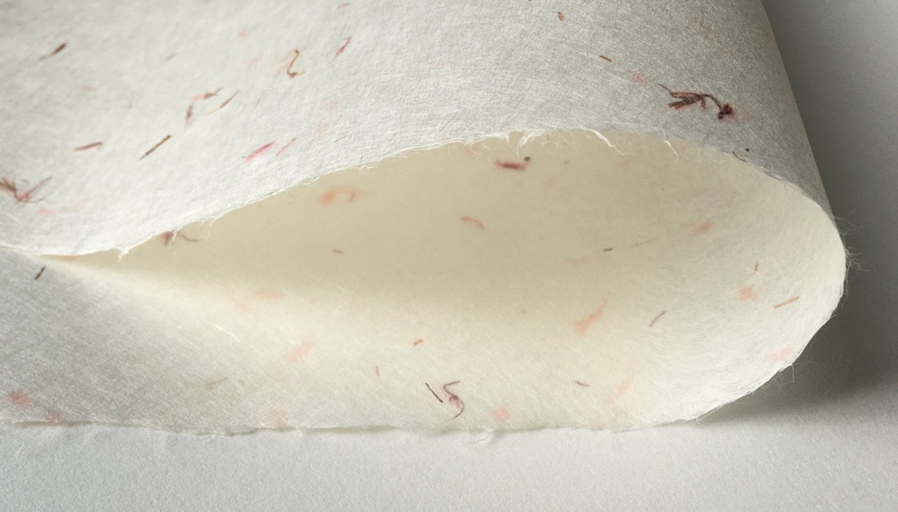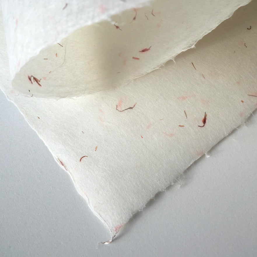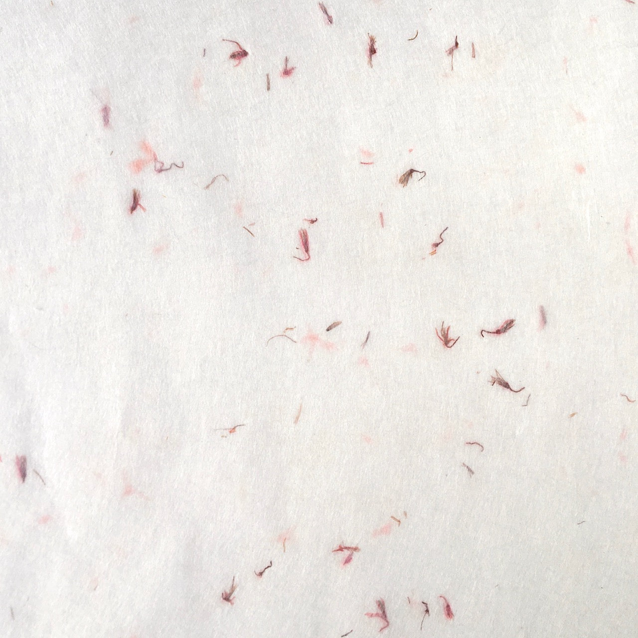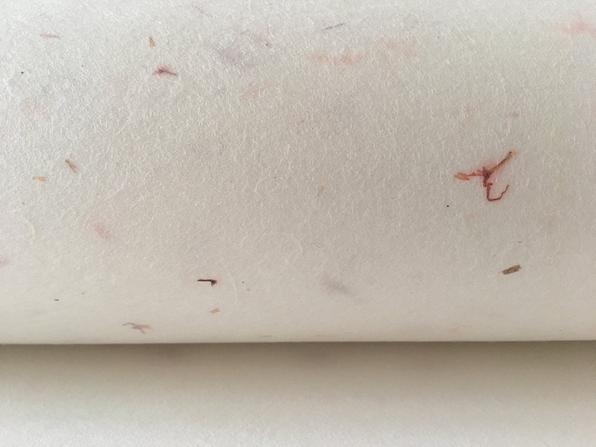 Hisako Uchimura makes paper in her one-woman shop near the town of Ogawa. This paper uses high quality Kozo from China, and includes Safflower petals. It is a beautiful, luminescent sheet of paper, good for decorative uses, lighting and interior design, as well as printmaking and drawing.