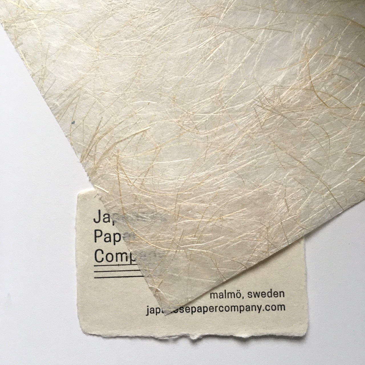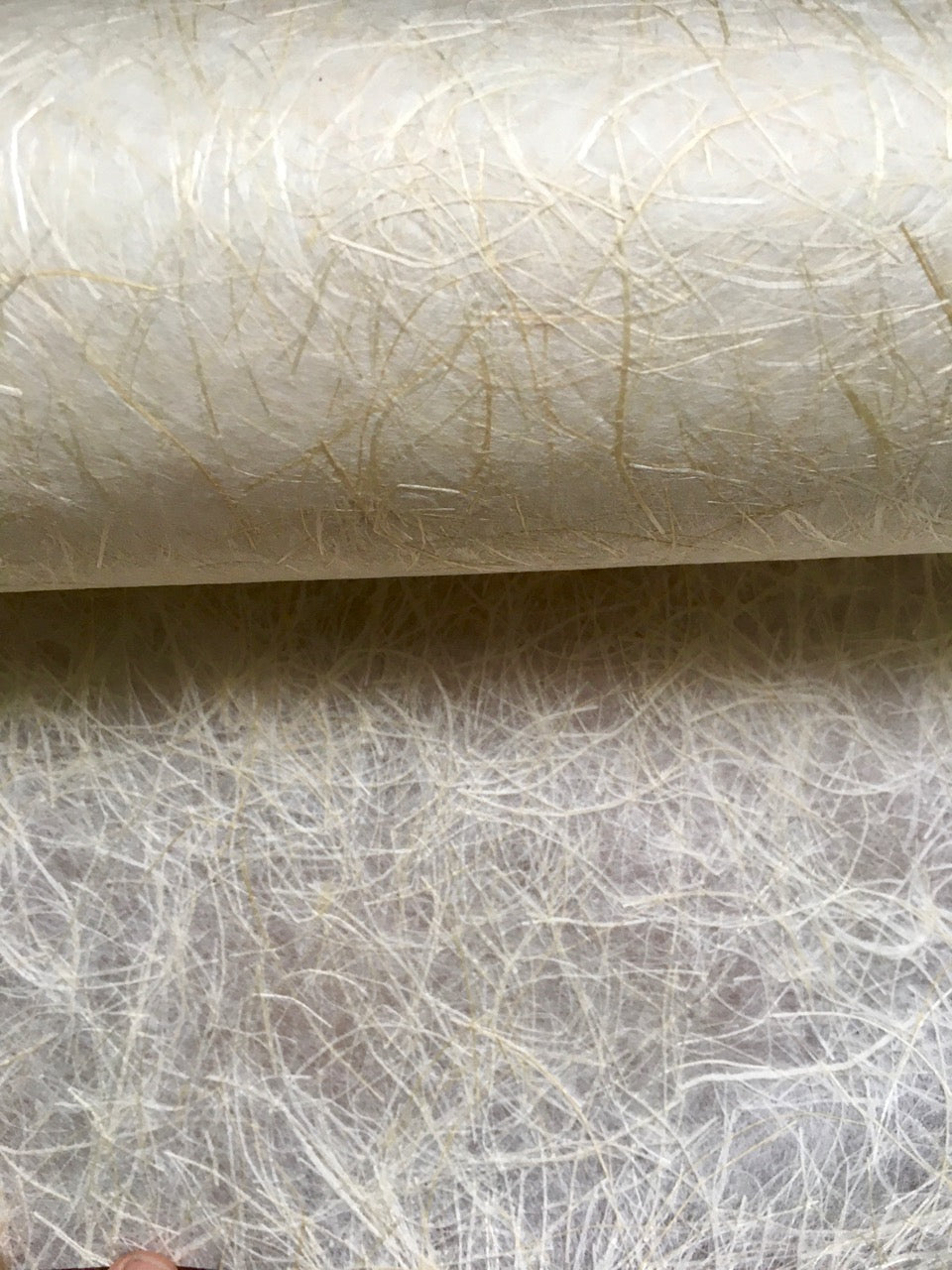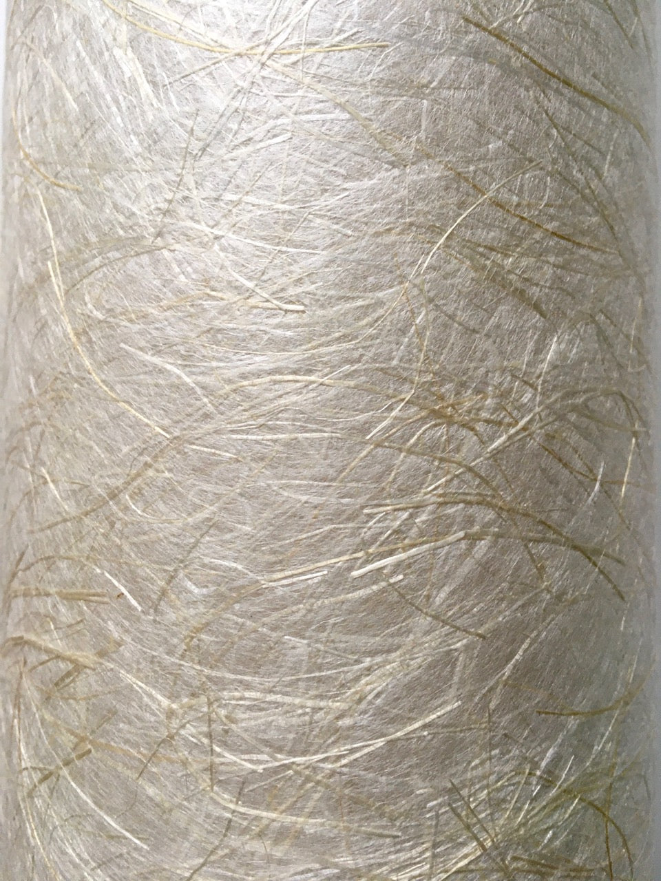 Kinwashi (longer fiber inclusions than Ginwashi) is a thin, crisp decorative paper with a beautiful sheen. It appears silvery-gold on a semi-transparent white background. It is perfect for interior design, collage, luxury packaging and lighting applications. One side is smoother than the other, and therefore can also be used for certain types of painting and drawing.