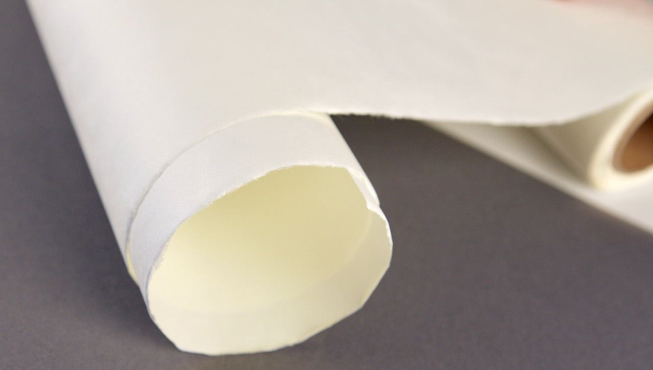 Shiramine is our largest-sized and heaviest washi roll. The paper is internally sized, making it able to stand up to many mark-making techniques. The two sides of the paper have different surfaces, one with more tooth, and the other side smoother. A versatile paper for artists working in mixed-media, encaustic, drawing and painting, as well as many different printmaking techniques. Made at the Awagami Paper Mill on the island of Shikoku.